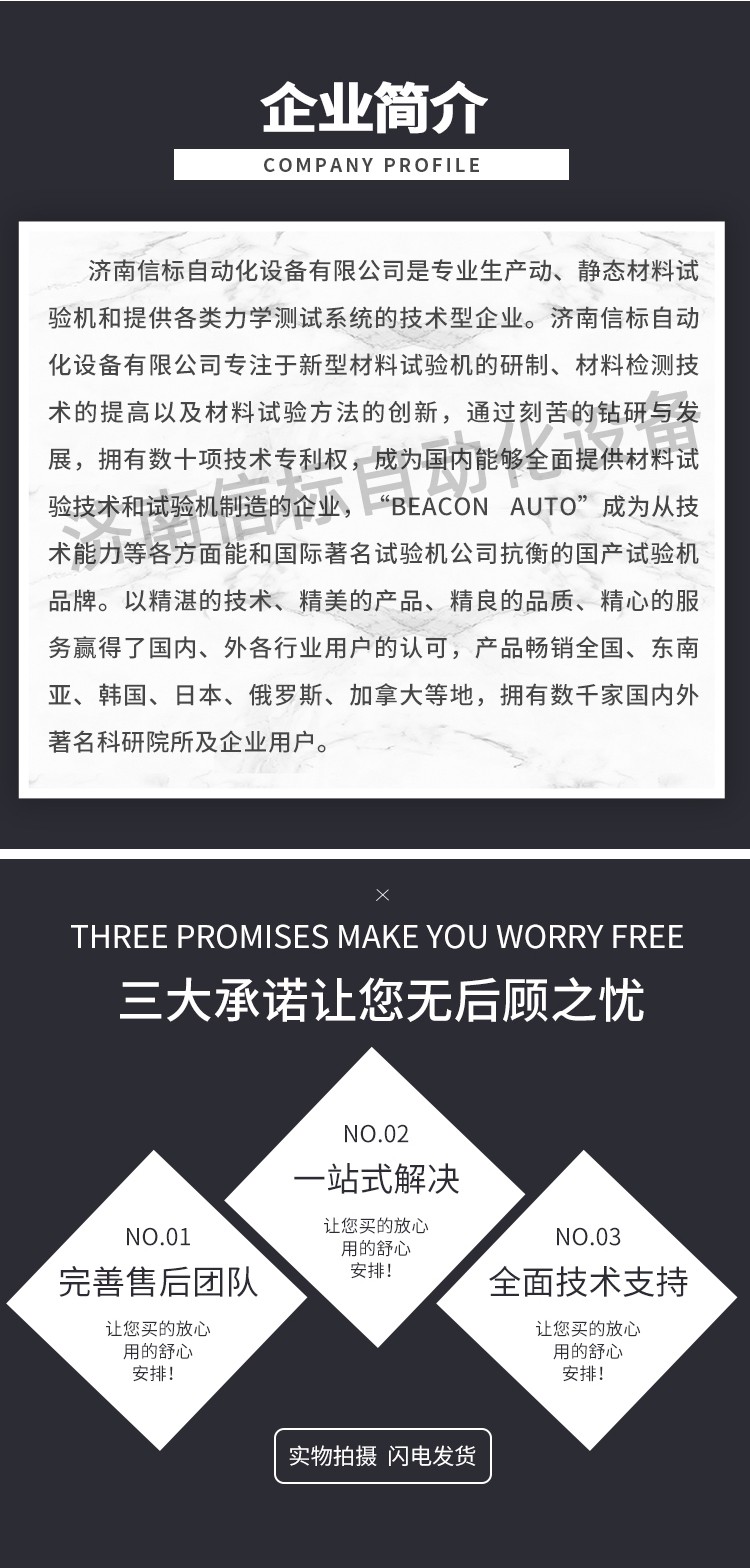 濟(jì)南信標(biāo)自動化設(shè)備有限公司主要生產(chǎn):動靜態(tài)萬能疲勞試驗(yàn)機(jī),接骨板彎曲試驗(yàn)機(jī),縫合線拉伸疲勞試驗(yàn)機(jī),髖膝關(guān)節(jié)磨損試驗(yàn)機(jī),電子萬能試驗(yàn)機(jī)、液壓萬能試驗(yàn)機(jī)、巖石三軸、四軸,電液拉力試驗(yàn)機(jī),材料試驗(yàn)機(jī),高低溫蠕變,高低頻疲勞,拉伸、扭轉(zhuǎn)、杯突等二十多個(gè)系列兩千多個(gè)的品種。 |